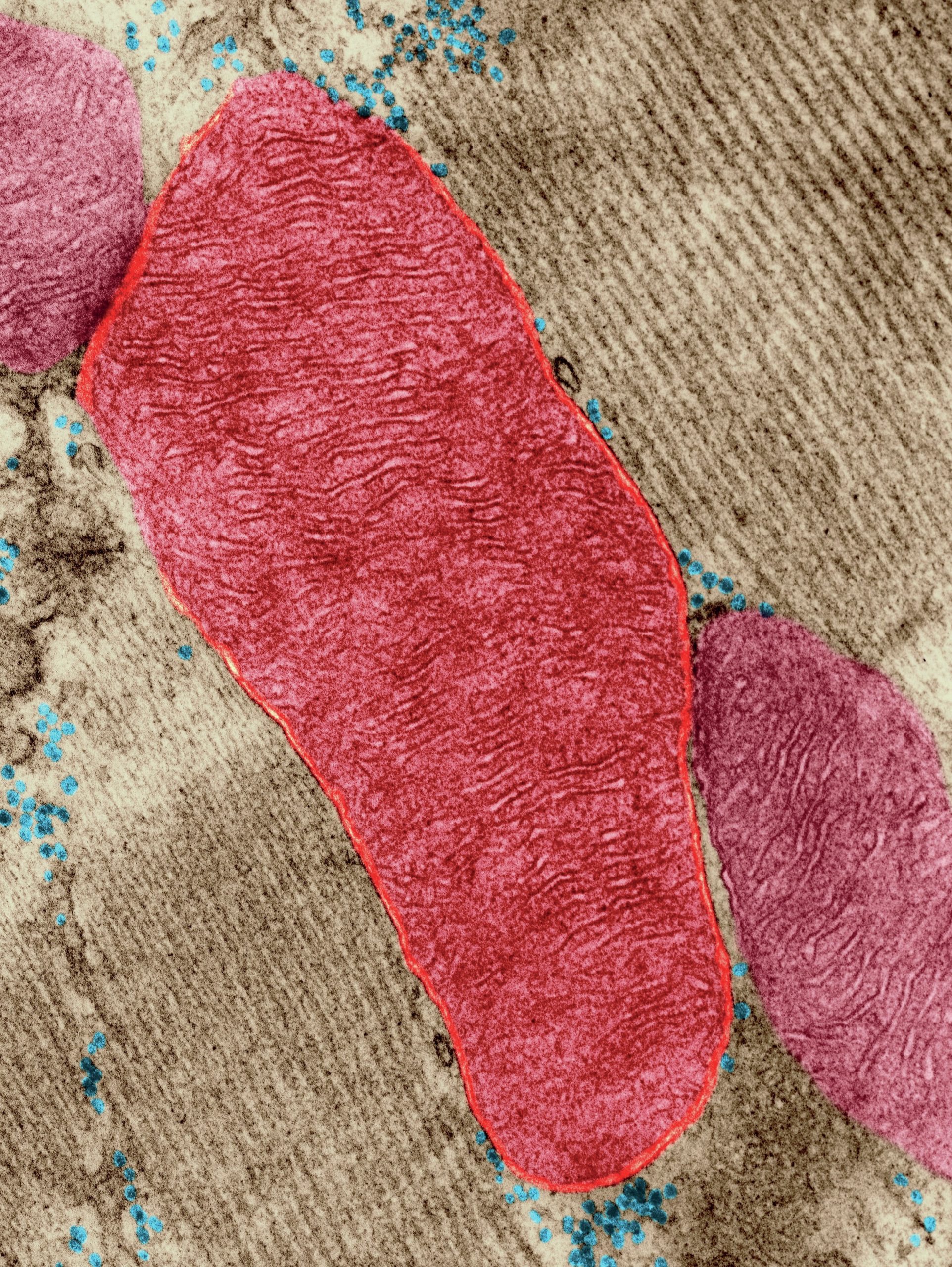Coloured transmission electron micrograph of mitochondria, which play a key role in apoptosis ×75 000
