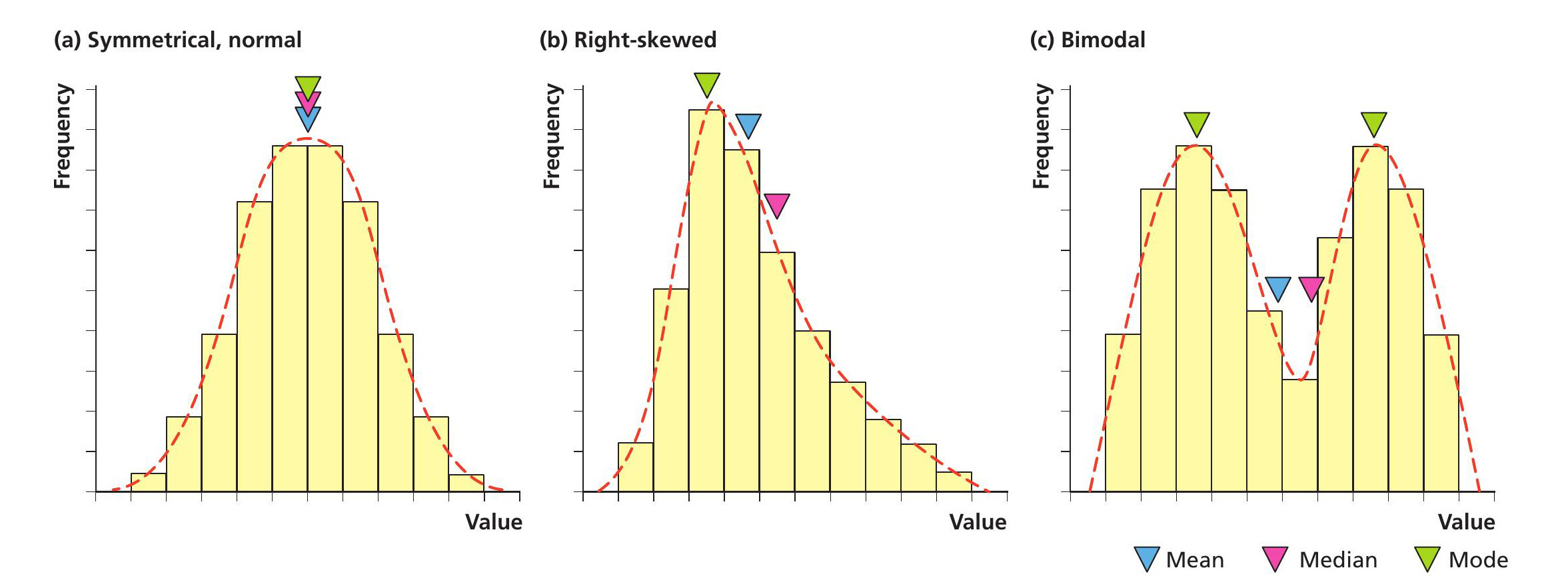 However, biological data are not always normally distributed. Figure 1b shows a skewed distribution with a tail of lower values to the right: it’s a right-skewed (or positive-skewed) distribution. Examples of this type of distribution include: