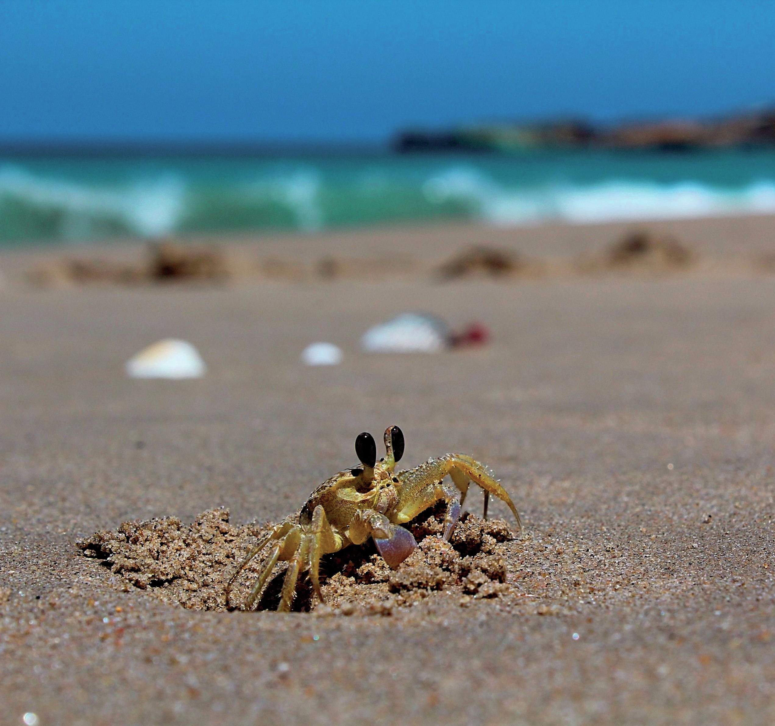 You may have found crabs in rock pools or have caught them from the sea using bait on a fishing line. As a result, you might think that crabs are aquatic animals. But although the Atlantic ghost crab shown in this picture is near the sea, the adult animals are terrestrial, living in burrows that they dig in the sand. These burrows can be over a metre deep and are usually above the intertidal zone. Burrows of old adults have been found in sand dunes over 300 metres inland from the sea.