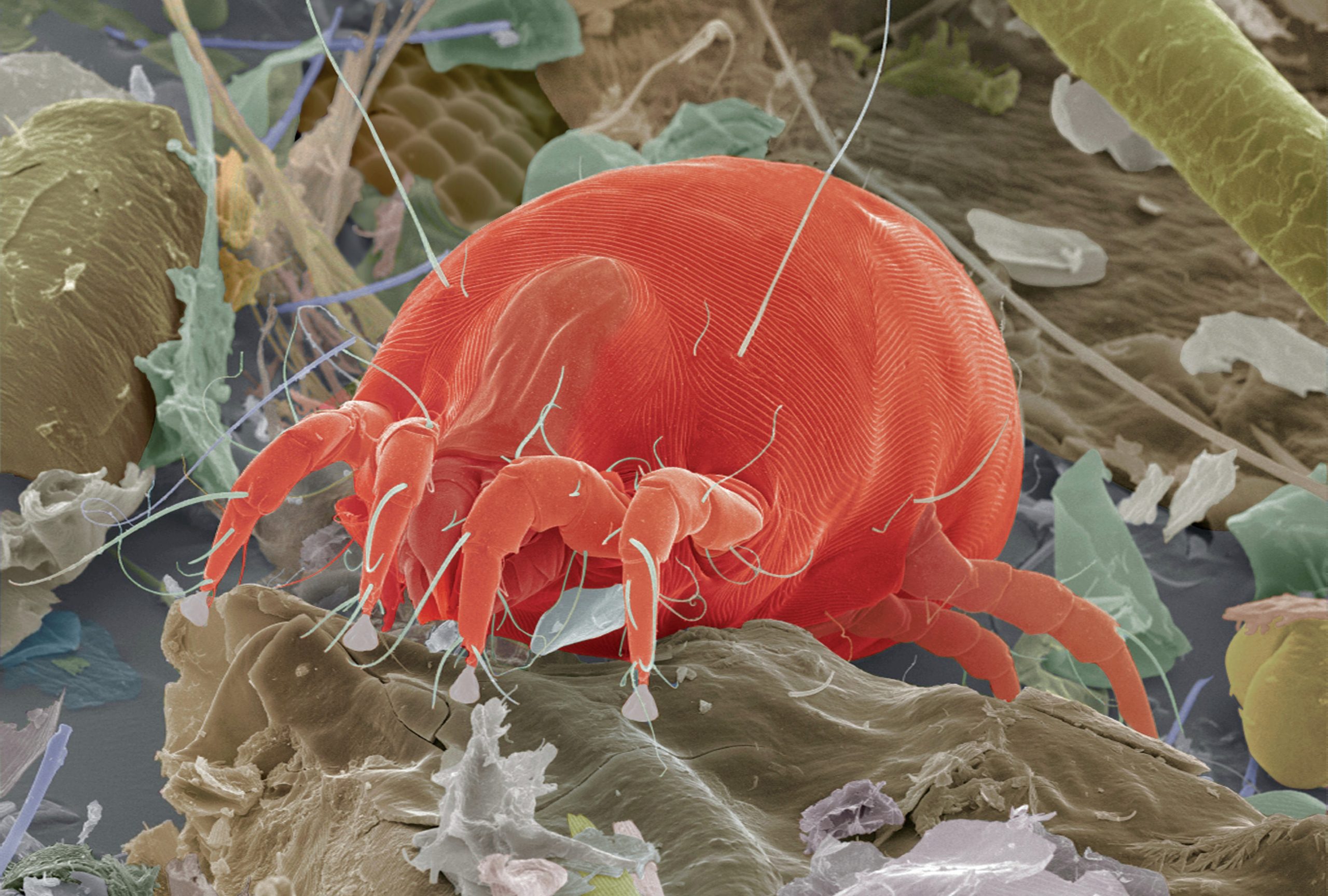 Figure 1 Coloured scanning electron micrograph of a dust mite. Millions of dust mites inhabit our homes, feeding on shed skin cells. They mainly live in carpets and furniture. They are usually harmless but enzymes in their droppings may cause allergic reactions in susceptible people (×400)