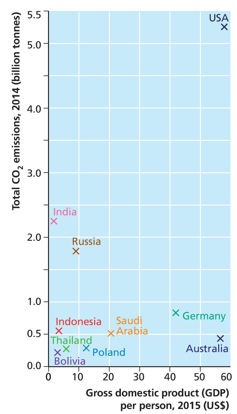 Identify three limitations of Figure 1 in showing the relationship between gross domestic product (GDP) per person and total CO2 emissions for selected countries. (3 marks)