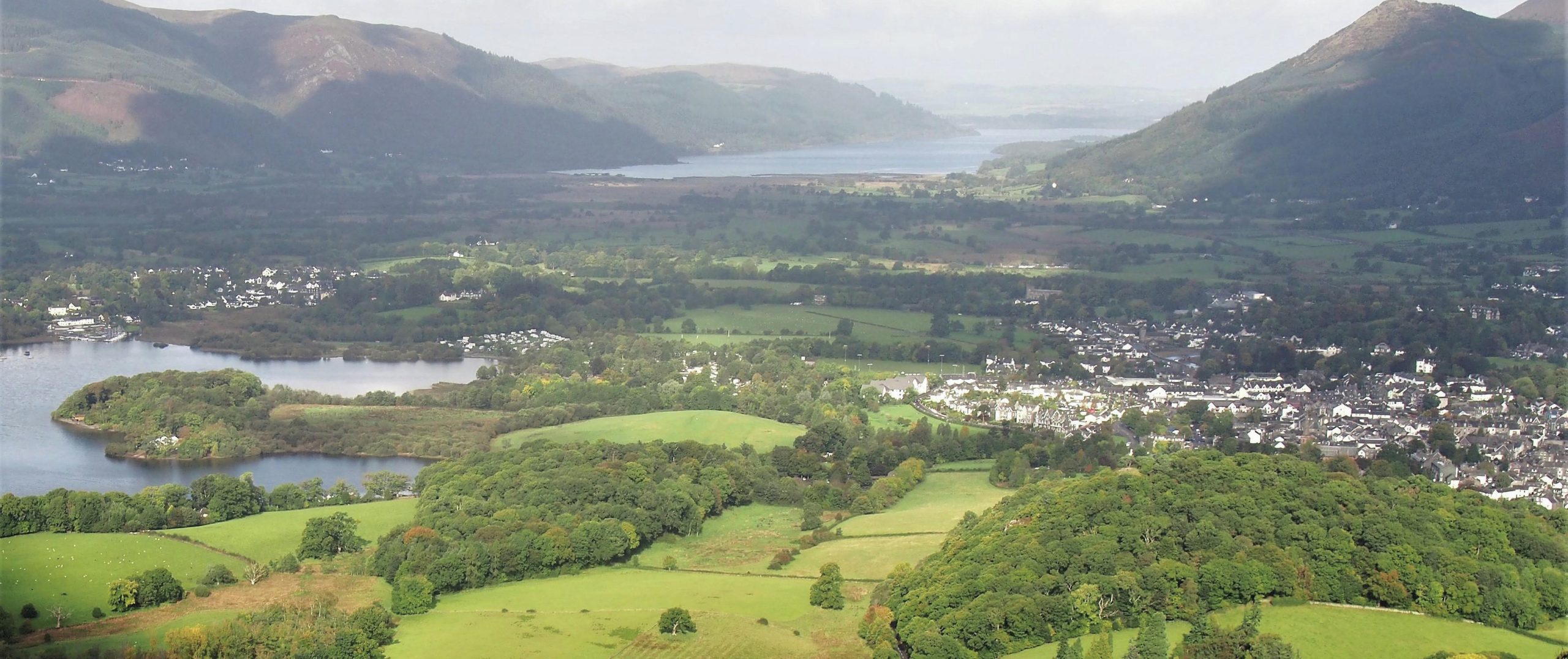 The photograph of the Lake District shows the head of Derwentwater on the left and Lake Bassenthwaite beyond with low-lying land between them. The outskirts of Keswick can be seen on the right. Figure 1 makes the layout clear.